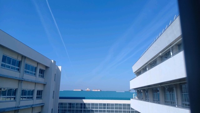 空をみると校舎から飛行機雲が見えました。
