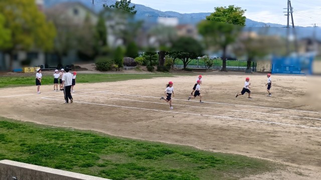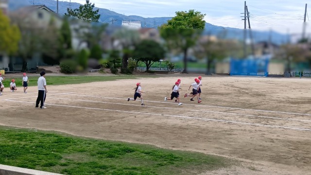 4年生が運動場での体育の時間でした。 50m走の練習かな。しっかり腕をふって、自分のベストタイムを更新しよう。 |