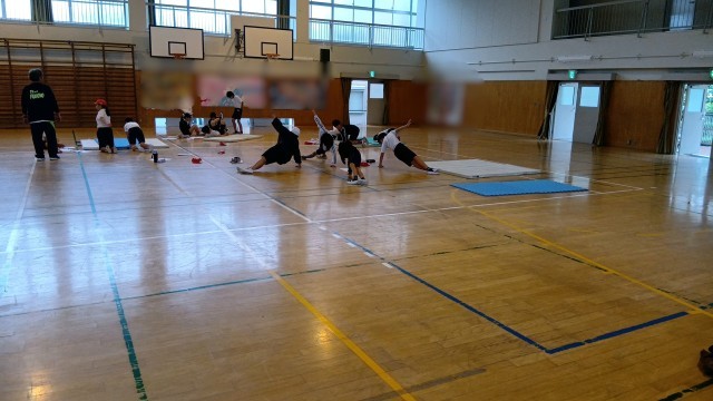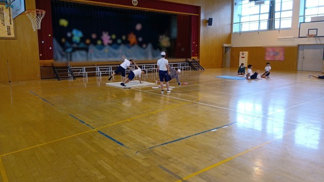 6年生が体育館で体育の授業をしていました。 グループに分かれて、今後行う組体操に向けての練習かな。 |