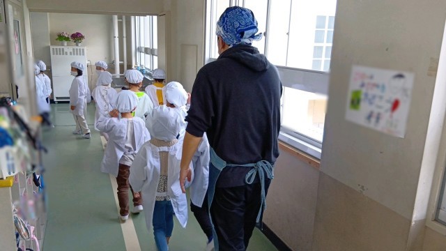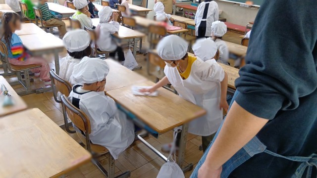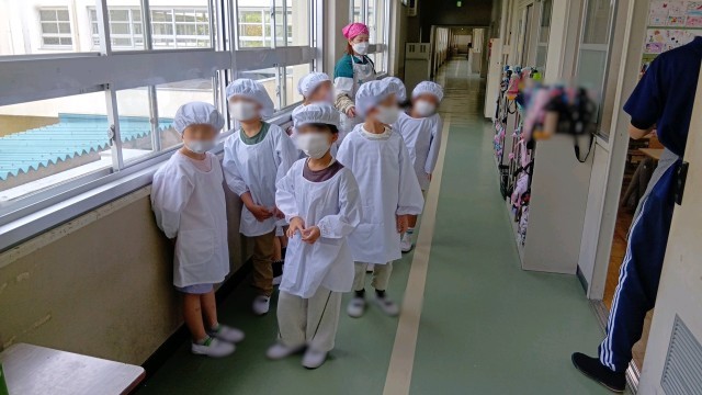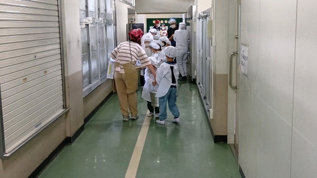 | 1年生のはじめての給食がスタートです。 給食当番さんが頑張ってくれていました。 |