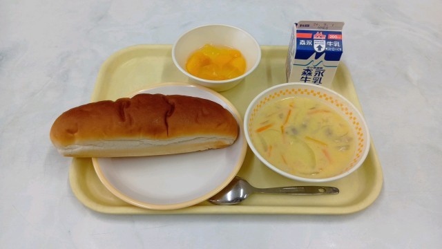 | 今日の給食はハニーパン、豆乳ポタージュ、桃カクテルでした。 豆乳ポタージュはクリーミーで、具材もとてもやわらかく美味しかったです。ハニーパンとも合っていました。 |