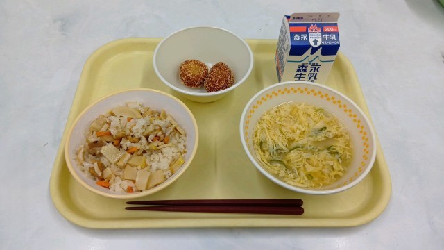 | 今日は、たけのこご飯、かきたま汁、米粉魚ナゲットでした。 たけのこご飯は鶏肉や薄上げなども入っていてお米にも味がしっかりしみ込んでいて美味しかったです。 |