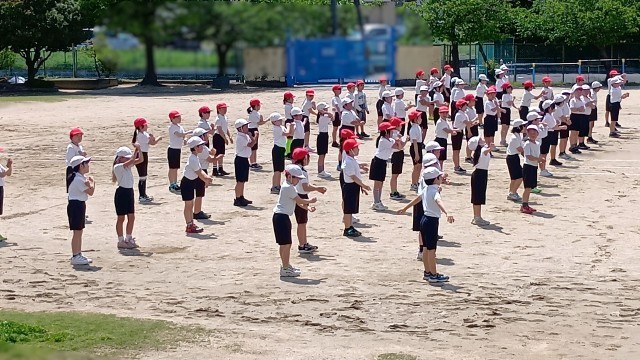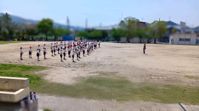 | 天気も回復して、良い天気の中、3年生が運動場で体育の時間でした。 今日はこのあと50mのタイムを計るかな。 まずは準備運動です。 |