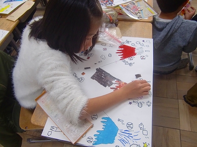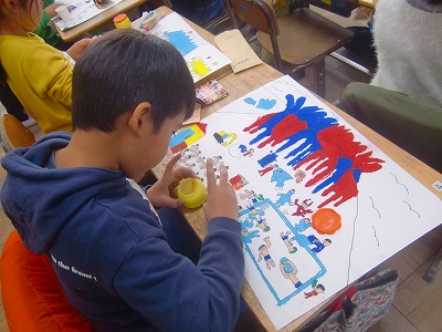 3年生は、図工で火山噴火をモチーフに、図工の様々な技法、例えば、水彩画やクレパス、貼り絵などを使って、独自の世界観を展開しています。とりわけ貼り絵は新聞広告などを切り取って色鮮やかに使用しています。ほとんど何でもありの世界が広がりますが、それでいいのです。なぜなら「芸術は爆発だ!」(by岡本太郎)だからです。(標題は校長が岡本氏の名言を拝借したもので、実際の3年生の標題とは関係ありません)