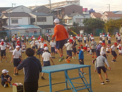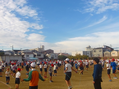 12月6日(金)のなわとび集会です。風は冷たいものの、青空がすがすがしく、日差しはポカポカと暖かいです。朝礼台に立ち、子ども達へ見本の跳び方を示すのは、実は、5.6年生の体育委員会の児童です。同じく最前列のさらに前方に体育委員会の児童がお手本として並びます。「あんなふうに跳びたいな」低学年達のあこがれの存在でもあります。ガンバレ1体育委員会!
