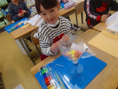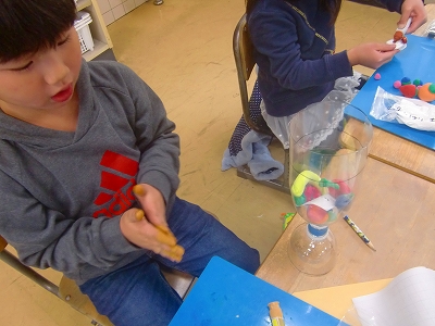 どうも2年生の「フルーツパフェ」の進行が気になり、教室をのぞきますが、そうそう運よく図工の時間に出会えるはずもなく、空振りが続きました。5時間目に、ようやく出会えたので、興味津々でのぞきますと、「入ってる入ってる・・フルーツ・・。」中身が入り始めていました。この後、どうなるのか、ますます楽しみです。乞うご期待!