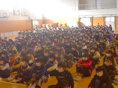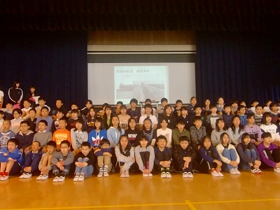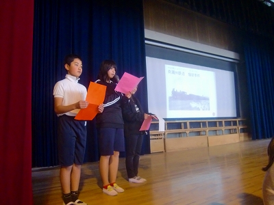 12月9日(月)、全校児童による平和集会が体育館で開催されました。6年生達が、修学旅行を含めた平和学習で学んだことの報告を全校児童に行うとともに、全員で「折り鶴」を歌う取り組みです。冒頭より体育館には、張りつめた緊張がみなぎっていました。ひな段に陣取る6年生達の真剣な雰囲気が、そうさせたのです。全員で歌う「折り鶴」が、体育館に響き渡る時、鳥肌が立つような感銘を覚えました。流石は「ふこのっこ」の平和集会です。