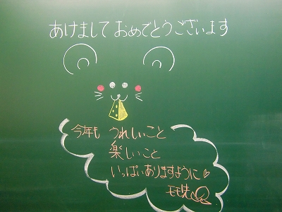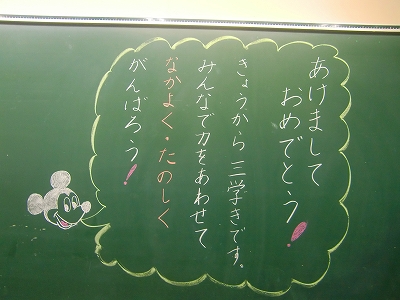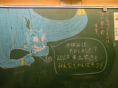 1月8日(水)の朝、始業式に先立ち、当然のことながら、子ども達はそれぞれの教室に入ります。そこで、子ども達は、担任の先生からの黒板メッセージに目を留めます。些細なことですが、子ども達と担任の先生との絆は、そんな場面からも育まれます。3つほど紹介します。