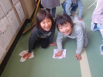 給食のない1月8日(水)始業式の下校時刻は11:00です。でも、そうじは行わねばならず、10:30〜10:45は、そうじ時間です。ここ1年生の教室では、新年早々、そうじに勤しむ子ども達の姿があります。妙に体格のいい子が散見されるのは6年生達です。なかよし学年として、そうじのお手伝いに来ています。最上級生が身をもって「自分達の学校を自分達の手で美しく」を教え導いています。すばらしい光景です。