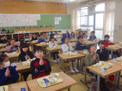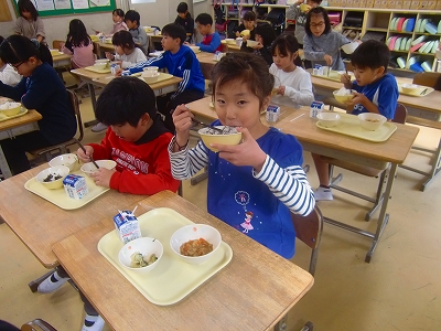 1月10日(金)、給食の献立は、牛乳、ごはん、豚肉のごま煮、かつおあえ、牛ひじきそぼろです。牛ひじきそぼろは、ごはんの上に乗せ、からめて食べます。誠に美味です。豚肉のごま煮は、その名の通り、香ばしいごまの香りが食欲をそそります。2年生の「いただきます」に合わせてシャッターを切ったのが左の写真です。大きな声できちんと「いただきます」が出来ていました。右の給食風景と共にお届けします。