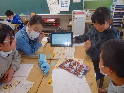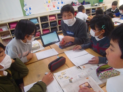 写真は、6年生の授業風景です。班の真ん中にタブレット型パソコンを置き、何やら話し合っているようですが、何の授業かおわかりでしょうか?正解は家庭科です。調理実習で作る献立の食材や作り方を調べているのです。私の子どもの頃には絶対に無かった授業であることは間違いありません。