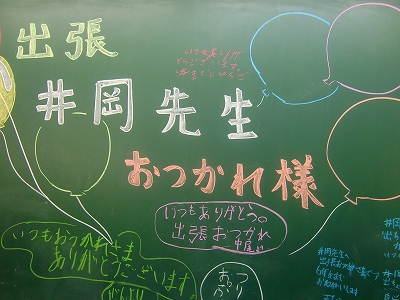 はばかりながら、私は教師生活ん十ん年なのですが、こんな黒板メッセージは初めて見ました。出張に出かけた担任の先生への、応援と感謝のメッセージです。感心しながら写真におさめていると、子どもから「いいクラスでしょう!」と声をかけられました。私もそう思います。流石は「ふこのっこ」5年生ですね。