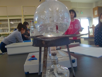 2月13日(木)、4年生は理科で「水をふっとうさせる」に取り組みました。もちろん、単にふっとうさせるだけではなく、温度計を差し込み、沸点が何度かを確かめるとともに、沸点以上には温度が上がらないことを確認しました。使用器具は、丸底フラスコ、ふっとう石、棒温度計、アルコールランプ、三脚などです。安全に気を付けながら実験ができる、流石は「ふこのっこ」4年生です。