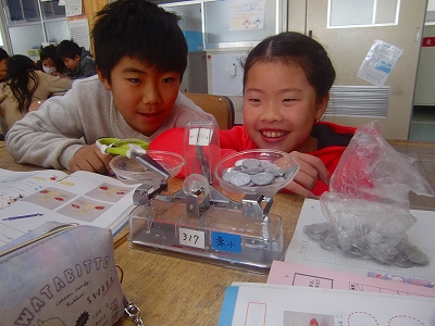 2月18日(火)3年生は、算数で「重さをはかる」に取り組んでいます。本物の上皿てんびんを使い、重さ比べを行ないました。手の感覚だけでは、よくわからない場合も、てんびんは正確に教えてくれます。1円玉を使用しているのは、重さが1gだからです。1円玉の枚数が、そのままg数になります。ちなみに、閲覧者の皆さまは1円玉の直径をご存知でしょうか?実は2cmあります。重さ1gで直径2cmの1円玉は小学校教育でよく使われます。