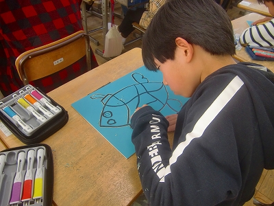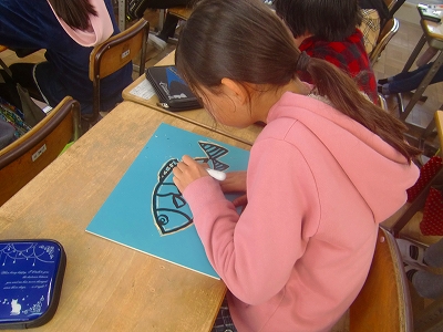 2月21日(金)4年生は、図工で「木版画」に取り組みました。昔は板にうすく墨をぬって、ほりあとが分かるようにしたものですが、今は、板がブルーにコーティングされています。さて、彫刻刀の扱いでの最優先鉄則は、刃先に手を置かないことです。4年生達は慎重にほりすすめ、教室は水を打ったように静まり返っています。おそらく完成すれば魚拓のようになるのではと思われます。乞うご期待!
