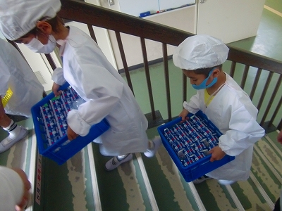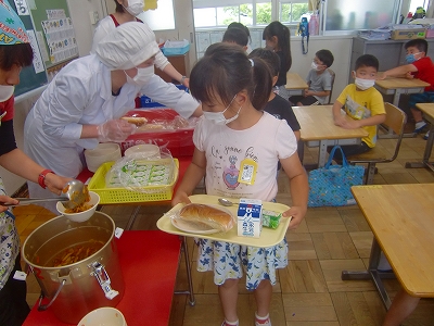 6月18日(木)、1年生にとって初めてとなる給食が始まりました。この間、他学年の給食をよそに下校していた1年生からは「2年生になったら給食を食べられるの?」との声も聴かれていただけに「よっしゃー1年生給食」と心中大喜びです。今日のメニューは、個別包装されたコッペパン、牛乳、やさいジュース、具だくさんのミートペンネです。例年1年生の最初の給食と6年生の最後の給食は「カレー」なのですが、今年度は異例の対応となっています。それでも、もちろん、感謝の気持ちを込めて「(心中)いただきます」の立派な1年生達でした。