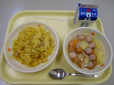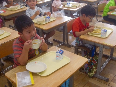 7月13日(月)の給食は、カレーピラフ、(具だくさんの)ポトフ、牛乳です。1Day a Weekだけど、ごはん!の登場に子ども達の顔もほころびます。かつては、ごはんは、3 Days a Weekだったのです。通天閣が黄色となり、心配は尽きませんが、子ども達の「おいしい!」の表情には、ほっとします。