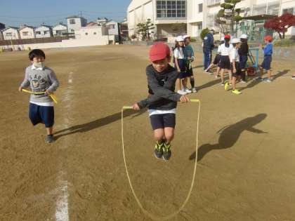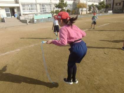 12月11日(金)、4年生は体育で「なわとび」に取り組みました。12月11日でも運動場はポカポカです。4年生達は華麗になわとび技をきめています。写真左は、「あやとび」と言う、腕を交差・開き・交差・開きを繰り返す難技です。態勢を垂直に維持するのが難しいです。写真右は「後ろ2重」と言う難技です。いわゆる2重とびの後ろとびバージョンです。なわの回転が速すぎてカメラでとらえきれません。心の中で『もっとゆっくりとんで!』とお願いしました。