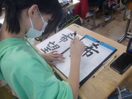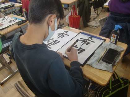 12月14日(月)、6年生は習字で「希望」という字に取り組みました。6年生にピッタリの教材と言えそうです。3年生の時に初めて筆を持った時の字は「一」でした。以来、練習を重ね、6年生の今では画数も多い「希望」です。教室の落ち着いた雰囲気は、心穏やかに半紙に向かう6年生達の気持ちを表しています。もはや書道教室の趣さえ感じさせるふこのっこ最高学年です。