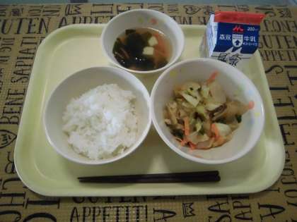 今日の献立は、ごはん・白身魚のみそ炒め・わかめスープ・牛乳でした。