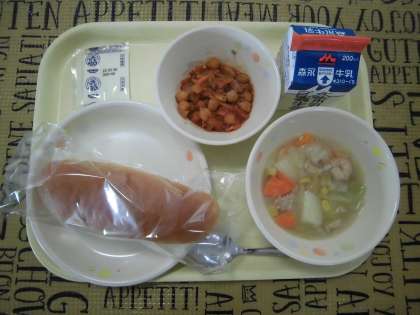 今日の献立は、コッペパン・えびと野菜のスープ煮・ひよこ豆のチリソース・ソフトチーズ・牛乳でした。