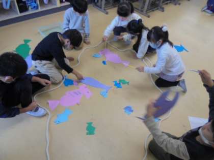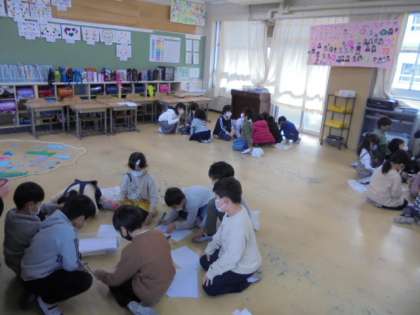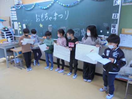 1年生と2年生がおもちゃ祭りをして交流をしました。2年生が作ったおもちゃを紹介して一緒に作ったり、そのおもちゃで遊んだりしました。2年生も1年生も楽しそうです。