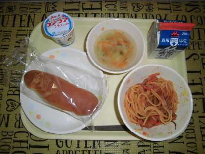 今日の給食は、ベビーパン・スパゲティナポリタン・野菜スープ・ヨーグルト・牛乳でした。