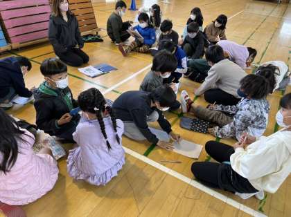 ペアになって行いますが、介助の役割の子が声をかけながら慎重に誘導している様子が印象的でした。