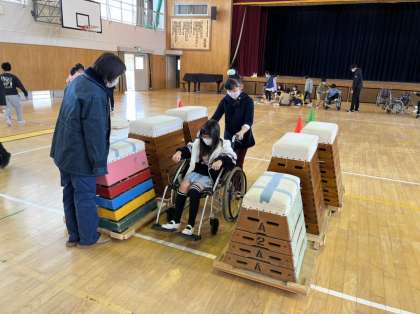 3年生は体育館で「バリアフリー教室」を行いました。これは「体験を通じて子どもたちが、誰もが暮らしやすい社会の実現、バリアフリーの必要性を理解すること」を目的に大東市が主催する体験学習事業です。
