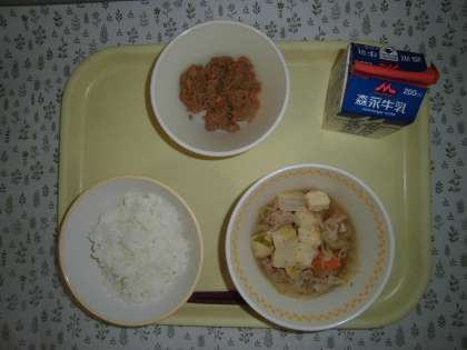 今日の給食は、ごはん、やっこ煮、かつおそぼろ、牛乳でした。