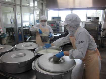 2枚めの写真は、炊きあがったごはんの中心温度を測っている様子です。給食では、ごはんやおかずの中心温度が85度以上になっているかを確かめています。