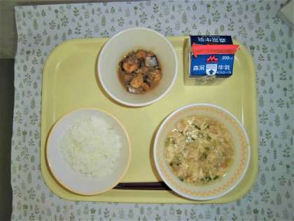 今日の給食は、ごはん、かきたま汁、さばのソース煮、牛乳でした。