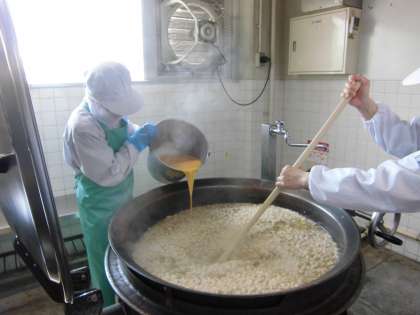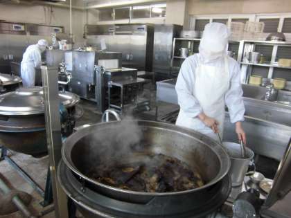 さばのソース煮は水、ウスターソース、砂糖、濃口しょうゆ、みじん切りにした土しょうがを釜に入れ、煮立たせた中に角切りのさばを入れて、昆布を落とし蓋のようにして、煮込みます(3枚めの写真)。味がしっかりついているので、子どもたちにも人気のメニューです。