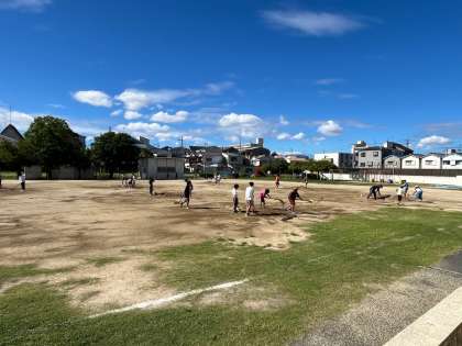 今日は朝から6年生が、シャベルで土の山を崩して整地をしてくれました。各クラス交代で頑張ってくれたおかげで、あっという間にきれいな運動場になりました。