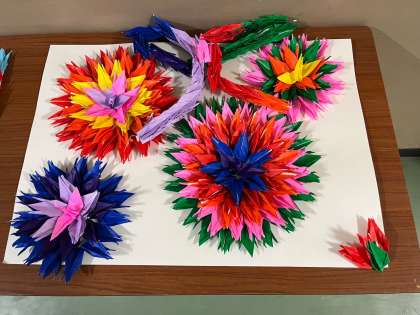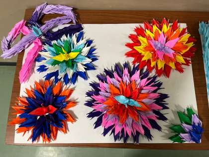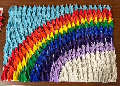 花やリボン、そして平和に架ける虹を折り鶴で表現しました。とてもきれいな作品です。