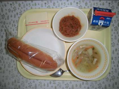 今日の給食は切り目いりコッペパン、野菜スープ、ミートサンド、スライスチーズ、牛乳でした。