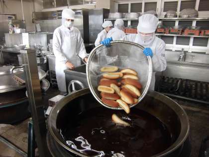 揚げパンは、職員室と1〜6年生までの14クラスをそれぞれ数を数えて揚げるので、全部で15回揚げます。