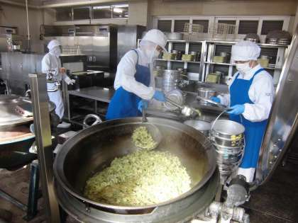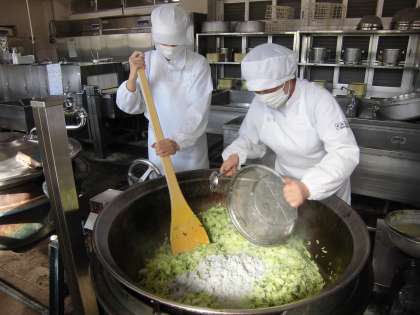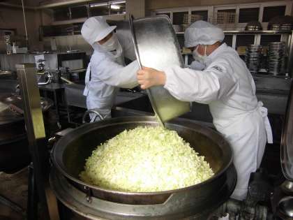 今日の小おかず、じゃこのおひたしは、キャベツを22.1キログラムとチンゲン菜を7.5キログラムを使っています。1枚めの写真は、キャベツを釜に入れたところです。キャベツは1玉で約1.3キログラムと言われているので、22.1÷1.3=17玉使ったことになります。たくさんのキャベツですが、出来上がりにしらす干しを入れるころには、量が3分の1くらいに減りました(写真2枚め)。