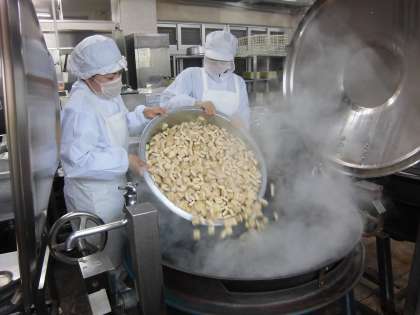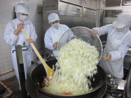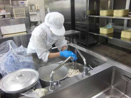 3枚めの写真は、うずらの卵を洗っているところです。10キログラムのうずら卵を、両手1杯分ずつ、傷んでいるものがないかなど確かめながら水洗いしています。卵のアレルギー食を別の鍋にとってから、釜の中にうずら卵を入れます。