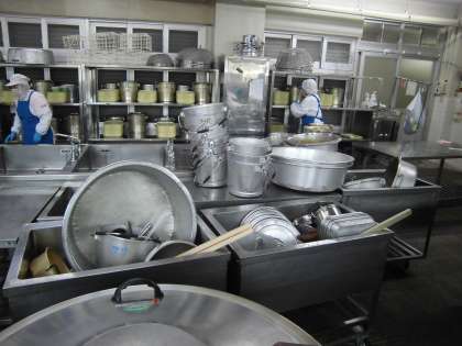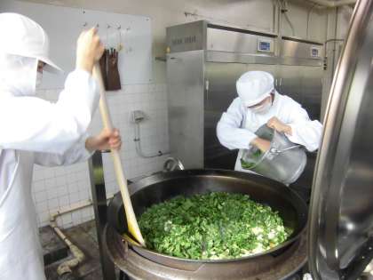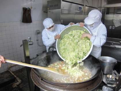 青菜のサッパリ炒めを作る様子の続きです。1枚めの写真は、白菜の葉の部分を釜に入れるところです。続いてチンゲン菜も葉の部分だけを入れます(2枚め)。たくさんの野菜を切るだけでも大変ですが、葉と軸を分けて切るのは、とても手間がかかります。
