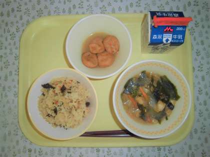 今日の給食は、肉めし、みそ汁、がんもどきの含め煮、牛乳でした。