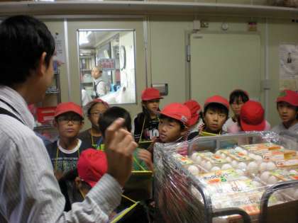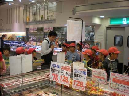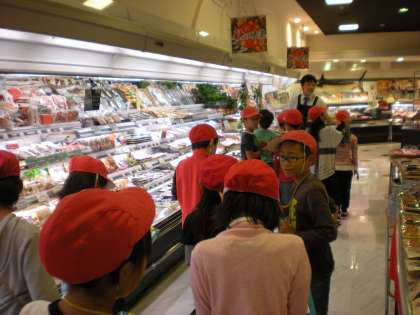 普段は入れないバックヤードにも入れてもらいました。スーパーマーケットの工夫を色々と教えていただきたくさん発見をし、ワークシートにしっかりメモしてきました。帰ってからは、それぞれのスーパーごとに振り返りました。