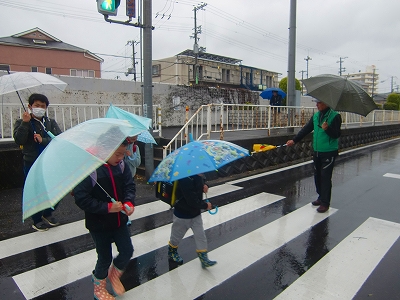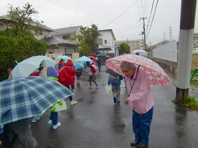 4月10日(水)の登校時は大荒れの天候の中の登校となりました。特に風が強く、強風注意報が発令されている中、傘をさしての登校です。見守り隊の方たちは懸命に、「傘を風に取られないように注意して!」「風に逆らわない方向に傘をさしや!」などと声かけをしながら誘導してくださいました。今朝は、民生児童委員さんも見守りに参加いただきました。子ども達を支援して下さる見守り活動に頭が下がります。