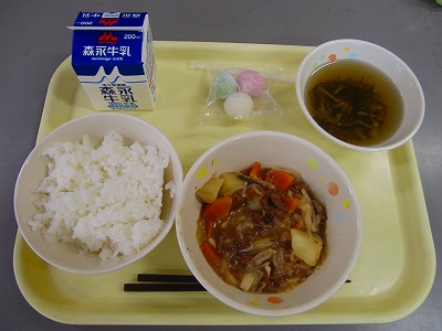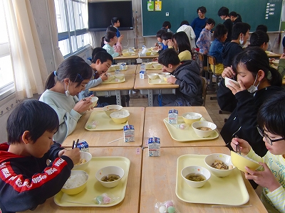 4月10日(水)のメニューは、お肉たっぷりのすき焼き煮、すまし汁、ごはん、牛乳、そして花見だんごです。本校は、自校方式の給食ですので、出来立ての給食をそのままいただけます。もちろん、とてもおいしいです。6年生の教室をのぞくと、整然としつつも、和気あいあいとした雰囲気の中で、給食を楽しんでいました。やっぱり、給食は最高です!