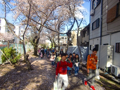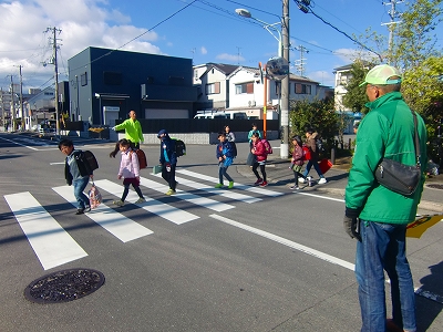 写真左は、桜並木の遊歩道を通って学校をめざす子ども達の集団登校の様子です。桜のトンネルをくぐって通う姿は、この季節ならではの光景です。きっと、大人になっても、桜を眺めながら小学校に通った思い出は、美しい記憶として残ることでしょう。写真右のあしづか公園前の横断歩道では、見守り隊の方と毎朝「おはようございます」とあいさつをかわします。こちらも、大人になっても、あいさつの習慣を教えてくれた見守り隊の方への感謝の記憶として、心に残ることでしょう。