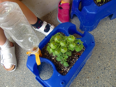 2年生が一人ずつ鉢植えで育てているミニトマトが、季節外れの高温と日差しのためでしょうか?ぐんぐんと成長しています。観察に余念のない2年生達ですが、早、青いとはいえミニトマトができていることに驚きの声をあげています。赤く色づくのも時間の問題のようです。真っ赤なみずみずしいミニトマトを頂ける日が楽しみです。