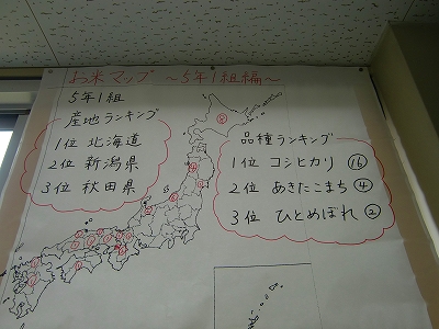 私たちが毎日食べる「お米」は、どこの産地のものが多く、また、どのような品種のものが多いのでしょう・・・?疑問解決は、机と黒板があればできますが、身近な具体物等の資料を参考にしながら、子ども達自身に調べさせる方が楽しく、また、身につきます。写真左はお米マップです。(上記の疑問は、北海道産でこしひかりが正解)。写真右は、お米の袋の実物です。今年度、5年生は、谷川のたんぼを借りて、実際にお米作りの体験学習にも挑戦します。「体験に勝る教師なし」乞うご期待!