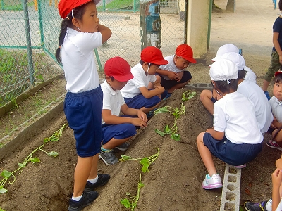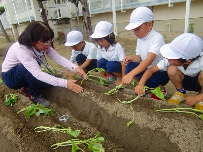 1年生は「あさがお」を育てる一方、6月11日(火)には、「いもの苗を植える」に挑戦しました。きれいに形作られた「うね」は、地域ボランティアの方の尽力によるものです。うねを作ることで、やわらかな土に苗をうえることができる上、土の空気に触れる面積も増大し、いもがすくすく育つとのことです。「こんな草みたいのから、本当にいもができるの?」半信半疑かもしれませんが、それだけに収穫が楽しみです。