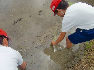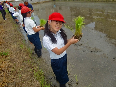 6月11日(火)。5年生は谷川の田んぼで「田植え体験」をさせていただきました。ひとり一人が苗を手にし、泥の中に足を踏み入れました。感動とも悲鳴とも、歓喜とも困惑ともとれる声が漏れ聞こえる中、体験でしか味わえない学びができました。感想には「かえるとか、たにしとかがいっぱいおった」(教科書には載ってなかったとの抗議)や「気持ちよかった。収穫が楽しみ」「農家の方がどれだけ苦労しているかがわかった」など多様でした。今回、子ども達に「田植え体験」の機会を与えていただいた農家の方、及び洗い場を提供して下さった谷川中学校に感謝申し上げます。なお、「田植え体験」の様子は広報「だいとう」の7月もしくは8月号で紹介予定です。