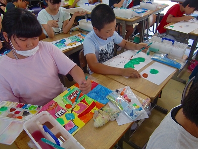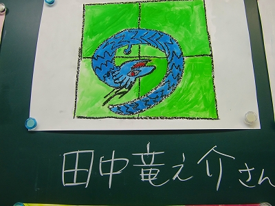 6月13日(木)5年生は図工で「ネームアレンジ」に取り組んでいます。「ネームアレンジって何?」とお思いのことでしょう。写真左は田中竜之介さんの作品です。田の中に竜がいるのがわかりますでしょうか。自分の名前を作品に取り入れる発想の自由なおもしろさを、水彩画やクレヨンで表現しているのです。流石は5年生です。AIには出来ないんじゃないかな?
